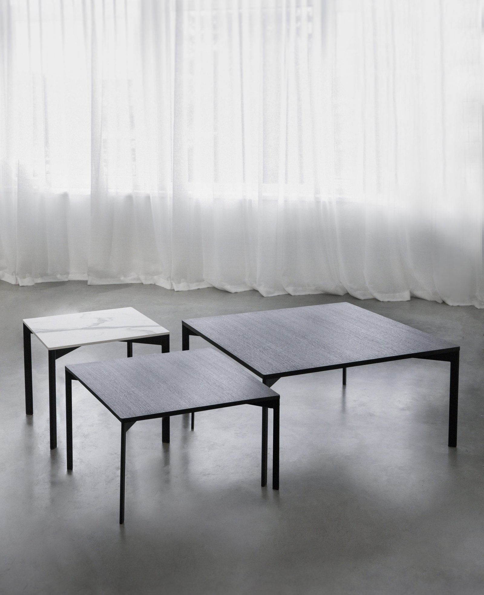 The ACORN table collection is the latest release from our successful partnership with Böttcher & Kayser. The collection, a series of square side tables, are available in a range of different sizes and feature a black metal frame with a choice of black oak, stone or black marble tops.